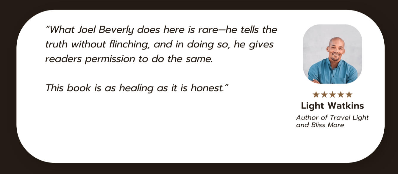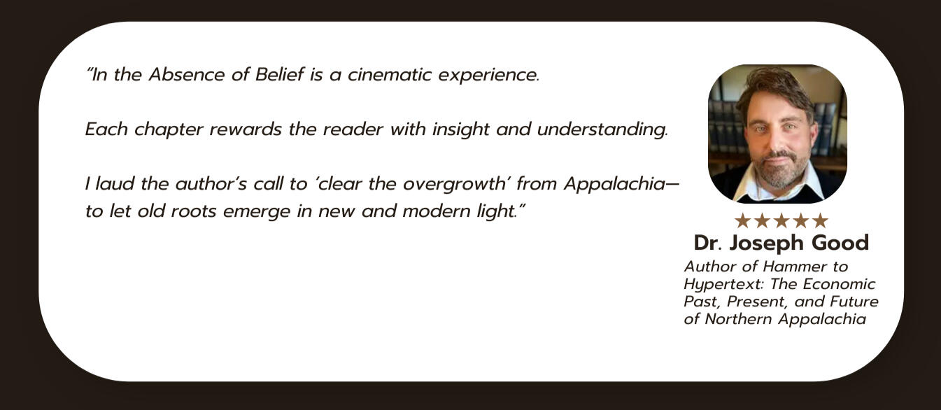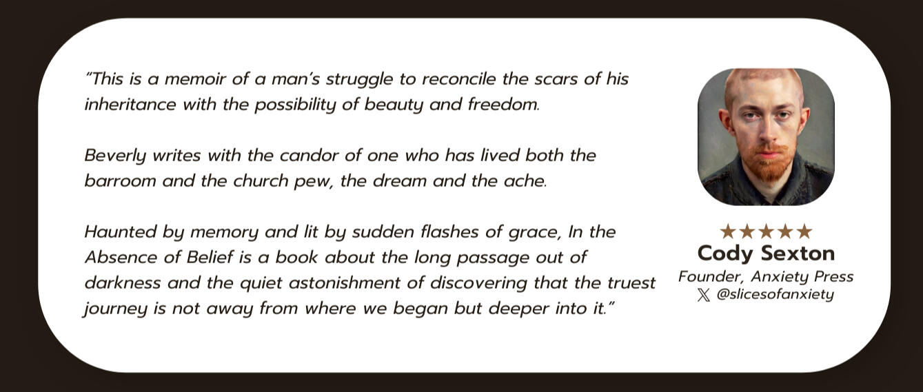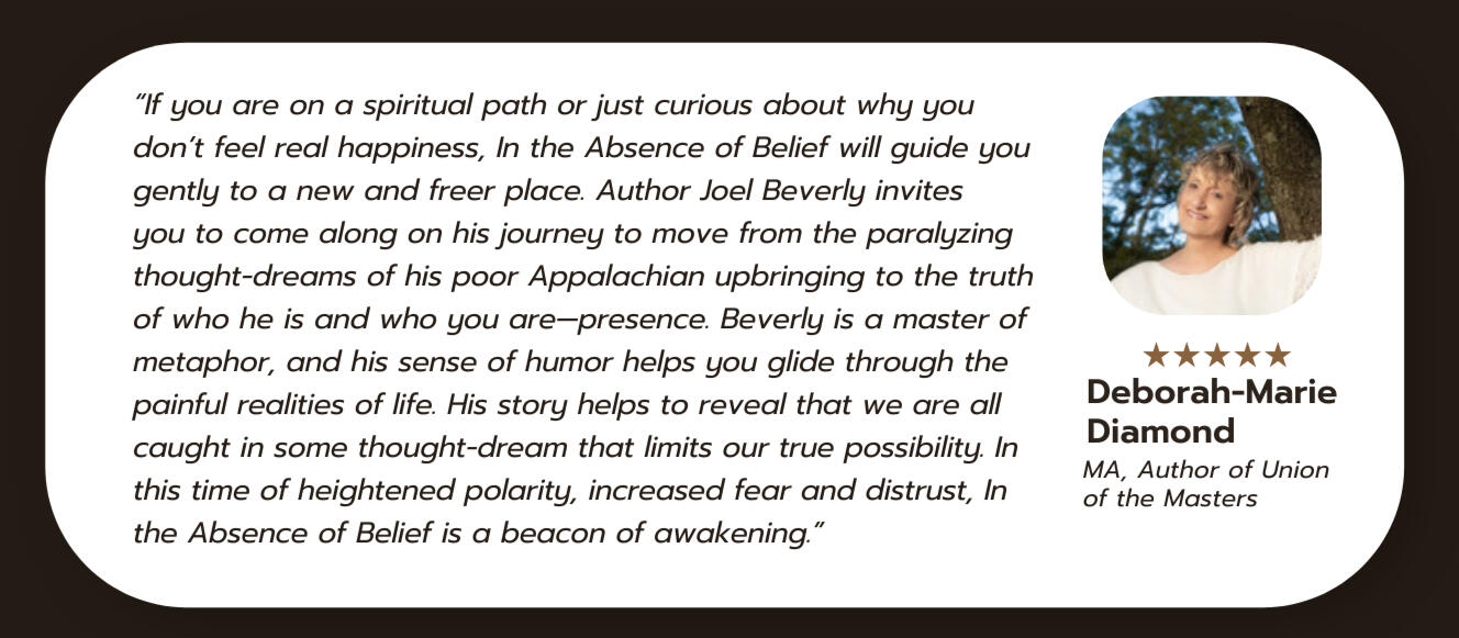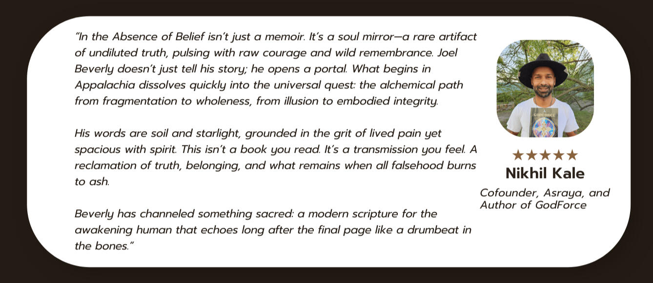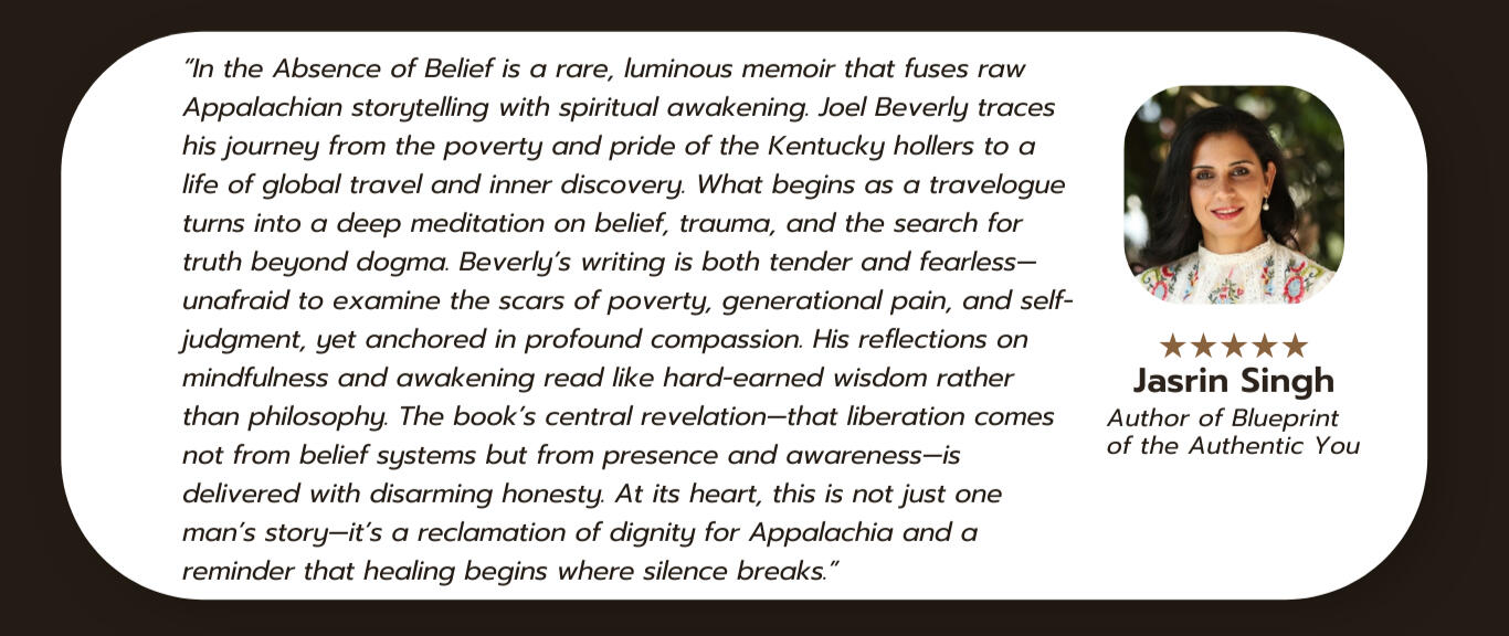Joel Beverly didn't find this inner peace by climbing new mountains of certainty.Quite the contrary.It was by letting the old mountains crumble.In his new book, In the Absence of Belief, Joel invites you into a cinematic journey from the poverty and cockfights of Eastern Kentucky to the quiet astonishment of radical presence.It is a declaration and a roadmap for the "Rebel," not one who shouts revolution, but one who dares to live without a flag, the one who realizes that a return to wholeness is the only rebellion left.